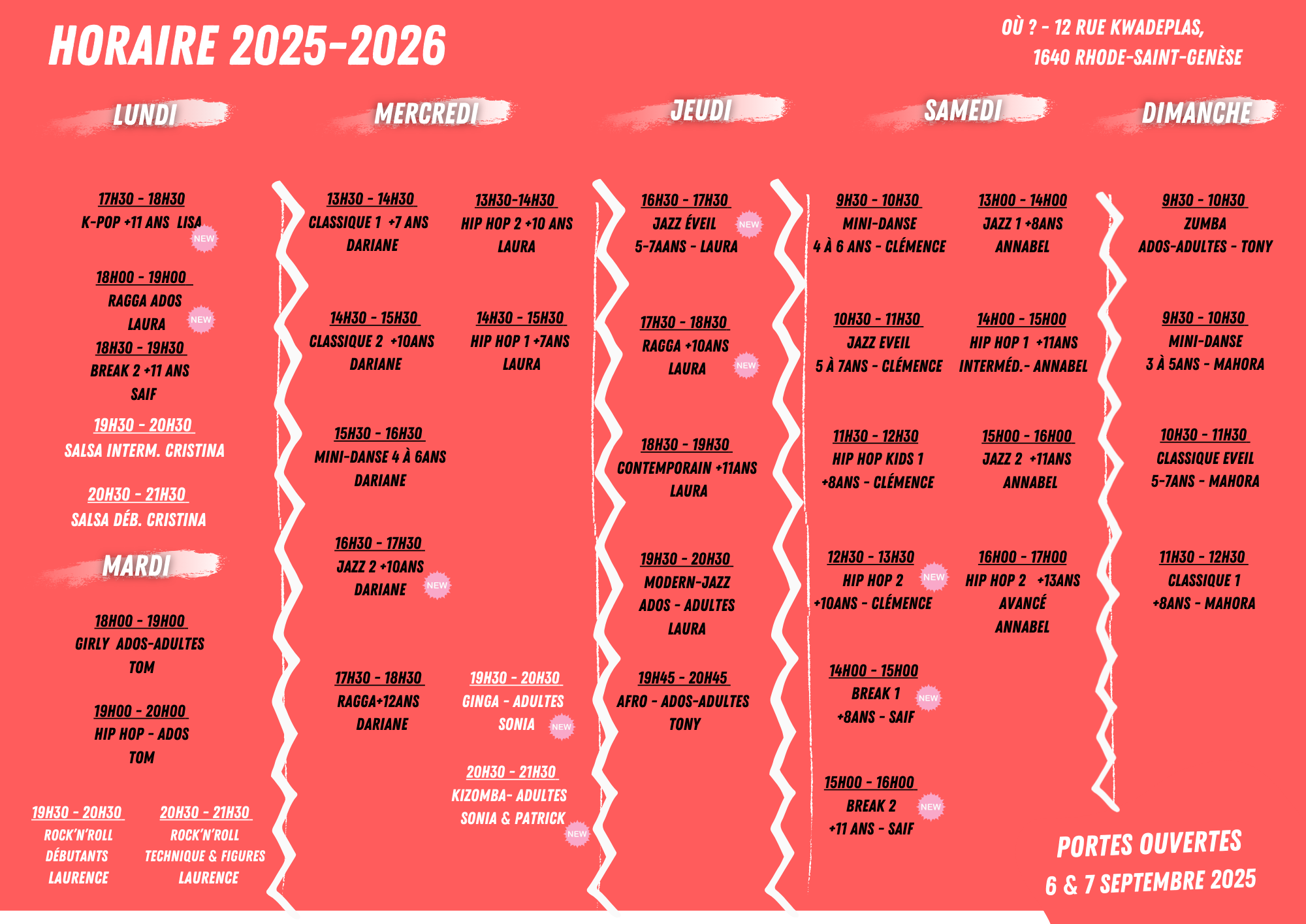 Le nouvel horaire propose plusieurs nouveautés : des cours K-Pop, ragga, Kizomba, .. mais aussi bien sûr tous vos cours préférés et vos professeurs fidèles qui continuent de partager leur passion avec vous.